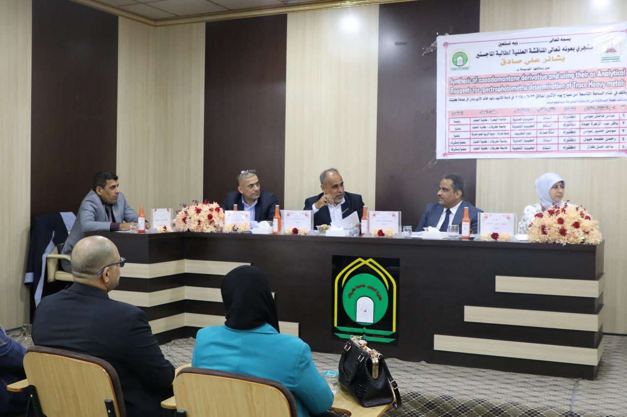 ناقشت كلية العلوم بجامعة كربلاء رسالة ماجستير للطالبة بشائر علي صادق من قسم الكيمياء، تناولت تصميم وتحليل مشتقات الآزادامانتان لاستخدامها ككواشف لونية انتقائية لبعض العناصر الثقيلة النزرة.