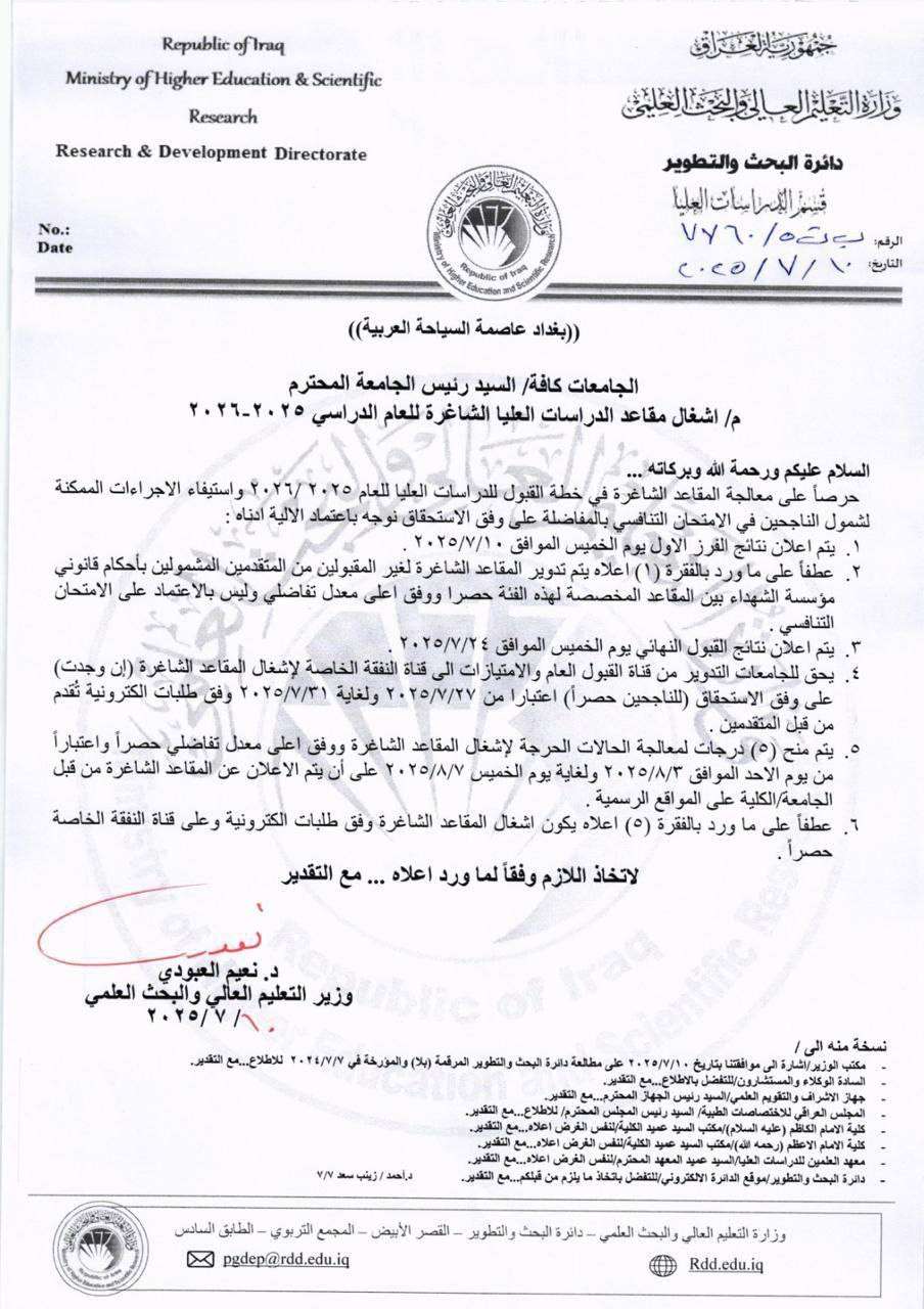 وجّهت وزارة التعليم العالي والبحث العلمي باعتماد آلية لمعالجة المقاعد الشاغرة في خطة القبول للدراسات العليا للعام الدراسي 2025-2026، بما يضمن شمول الناجحين في الامتحان التنافسي ضمن المفاضلة على أساس الاستحقاق.