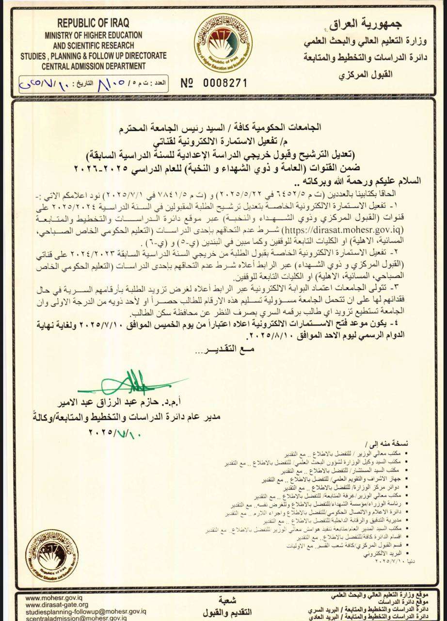 أعلنت وزارة التعليم العالي والبحث العلمي عن فتح باب تعديل الترشيح وقبول خريجي الدراسة الإعدادية للسنة الدراسية السابقة 2024-2025 ، وفق الضوابط الآتية: