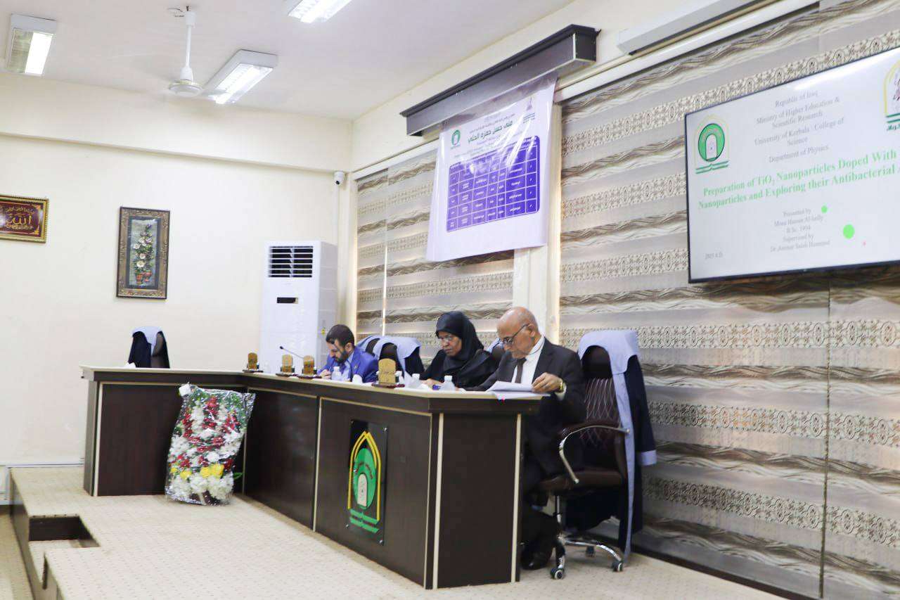 ناقشت كلية العلوم في جامعة كربلاء رسالة ماجستير للطالبة منى حسن حمزة من قسم علوم الفيزياء، تناولت تحضير جسيمات ثنائي أوكسيد التيتانيوم النانوية المطعمة بجسيمات الفضة النانوية واستقصاء فعاليتها المضادة للبكتيريا.