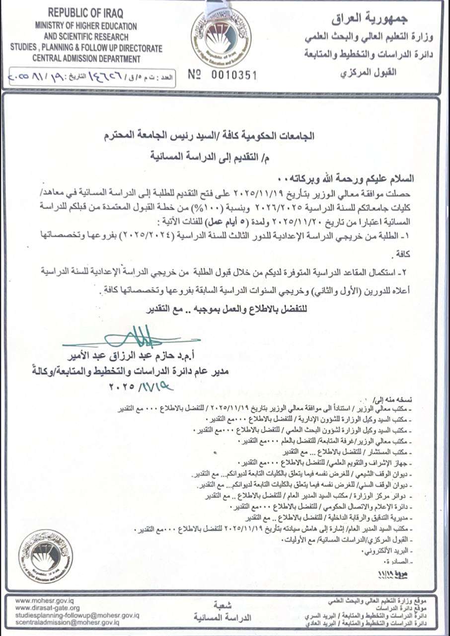تعلن كلية العلوم بجامعة كربلاء عن فتح باب التقديم للدراسة المسائية للعام الدراسي 2025–2026، وبنسبة 100% من خطة القبول المعتمدة للدراسة المسائية.