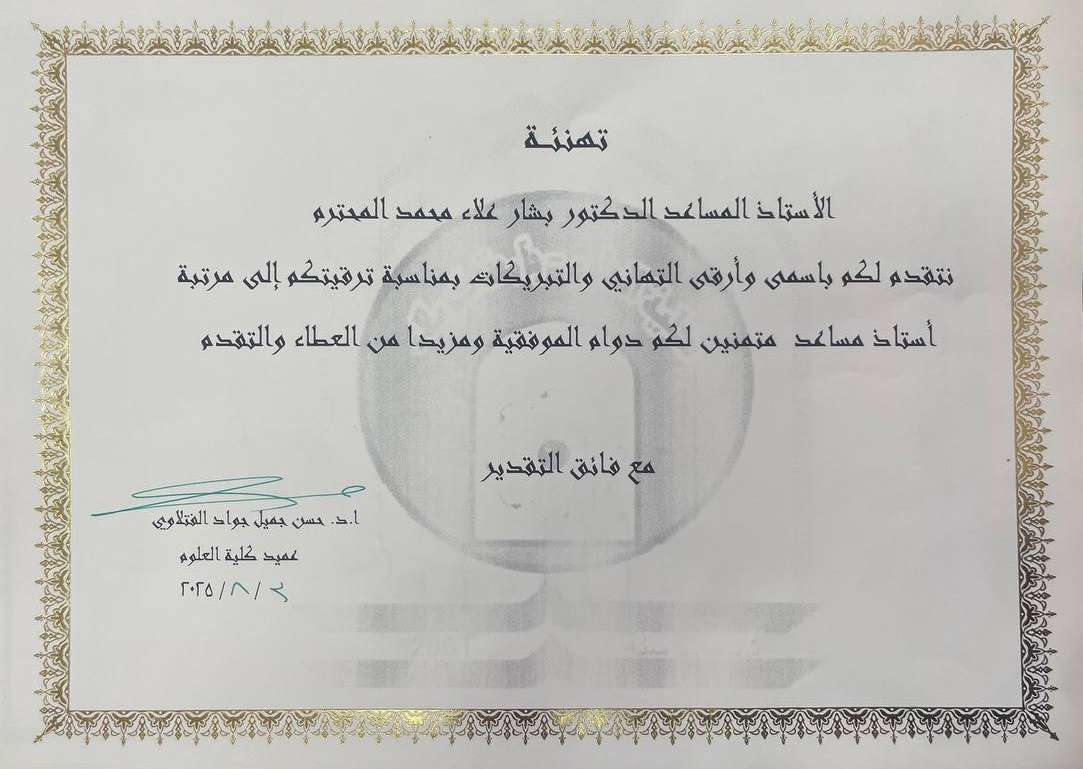 The Deanery of the faculty of Science, represented by the Dean, Professor Dr. Hassan Jameel Jawad Al-Fatlawi, extends its warmest congratulations and best wishes to Assistant Professor Dr. Bashar Alaa Mohammed on the occasion of his promotion to the rank of Assistant Professor.