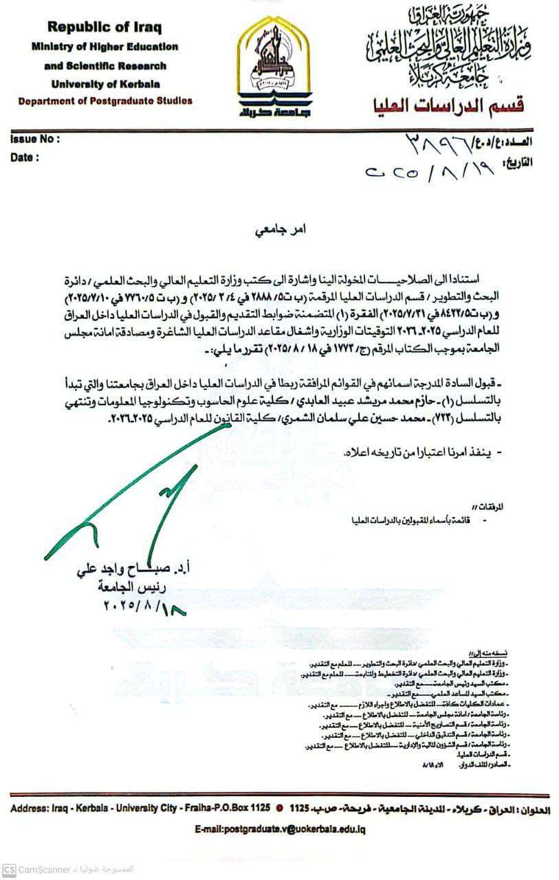 The fac of Science at the University of Kerbala has announced the issuance of the official university order for the admission of postgraduate students (Master’s and Doctoral programs) for the academic year 2025–2026. This decision is based on the regulations of the Ministry of Higher Education and Scientific Research and the endorsement of the University Council Secretariat.