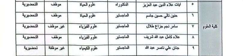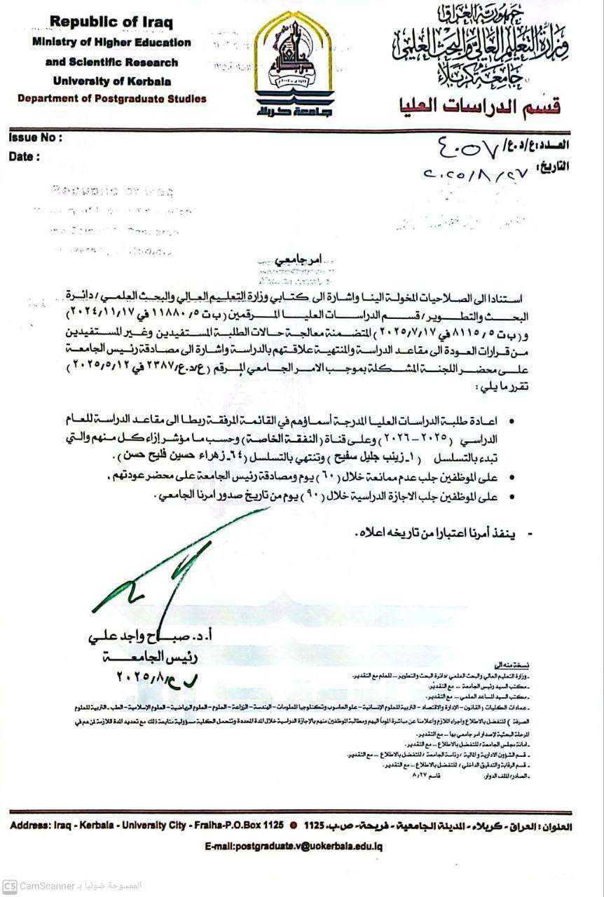 The College of Science at the University of Kerbala has announced the issuance of a university order addressing the cases of graduate students, both beneficiaries and non-beneficiaries of reinstatement decisions, as well as students whose enrollment had previously been terminated.
