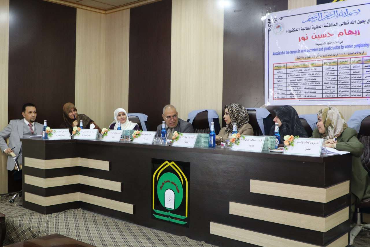 The College of Science at the University of Kerbala discussed the PhD dissertation of Riham Hussein Noor from the Department of Biology, which focused on evaluating physiological markers and gene expression of COX-2 and IL-23 in women with abnormal uterine bleeding.