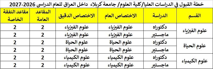 College of Science at the University of Kerbala has announced its postgraduate admission plan (within Iraq) for the academic year 2026–2027, as detailed below: